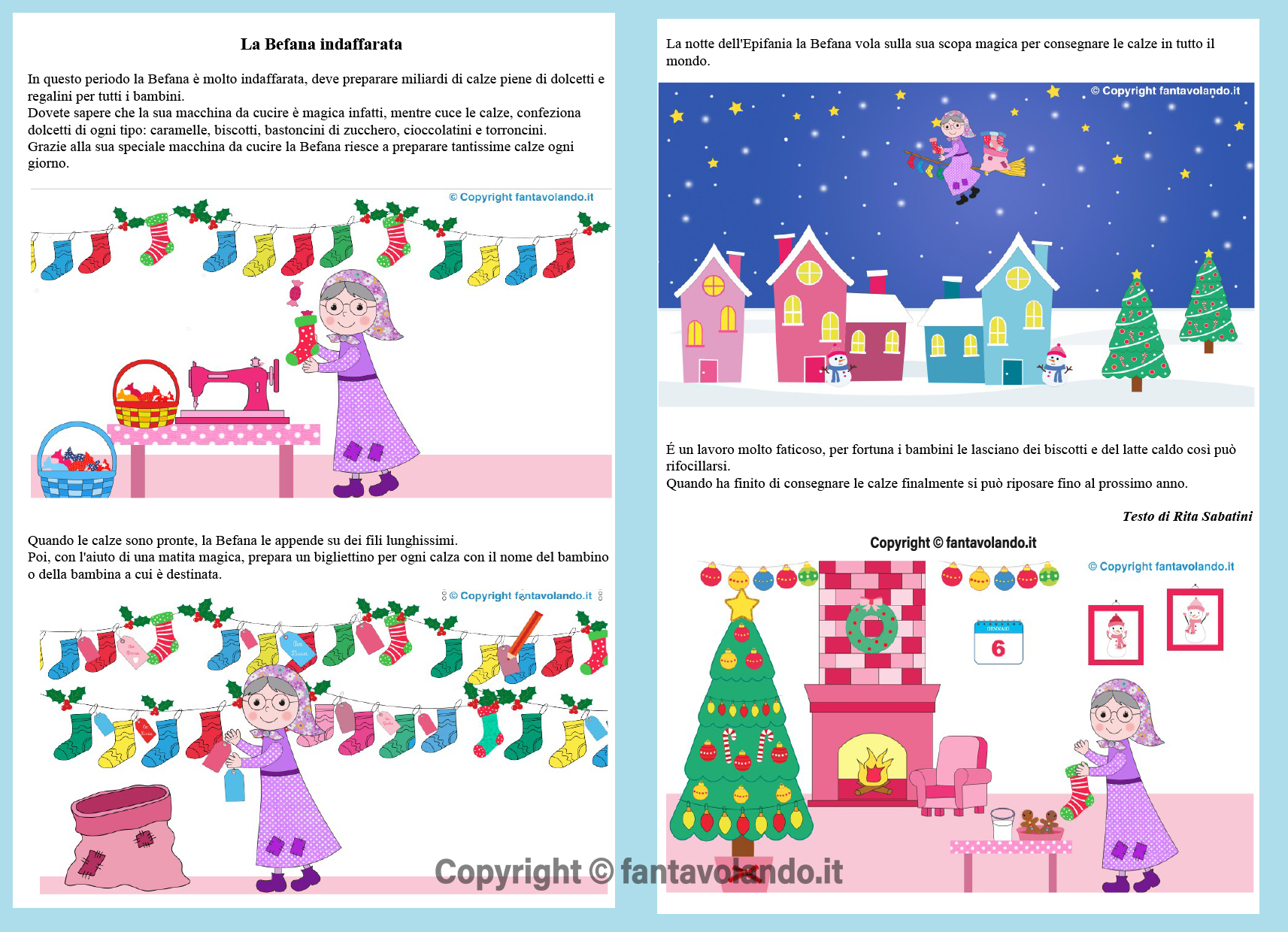 Per Natale possiamo proporre la storia La Befana indaffarata di Rita Sabatini (tutti i diritti riservati)Nel post trovate il testo della storia da stampare e i disegni da stampare e colorare.