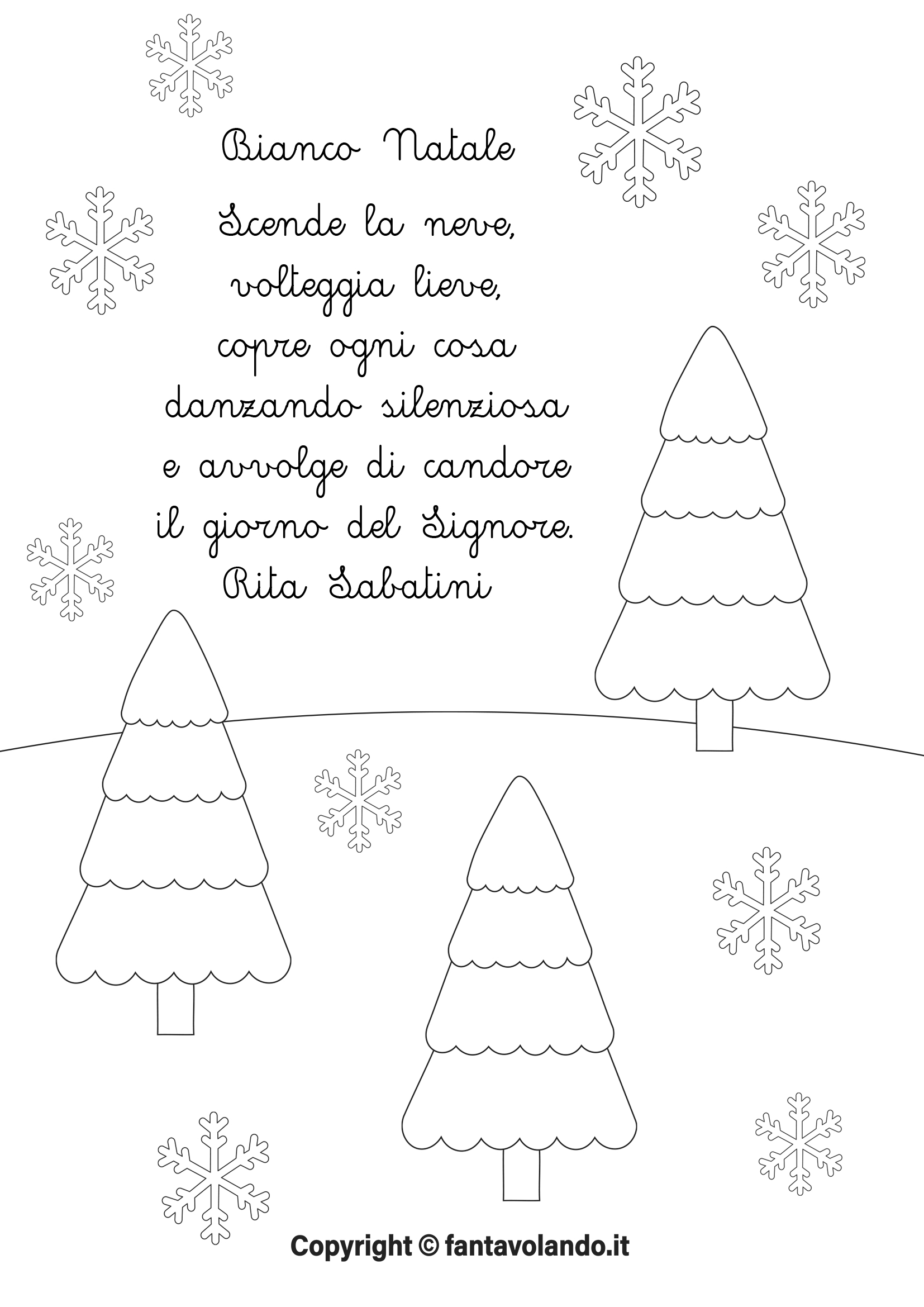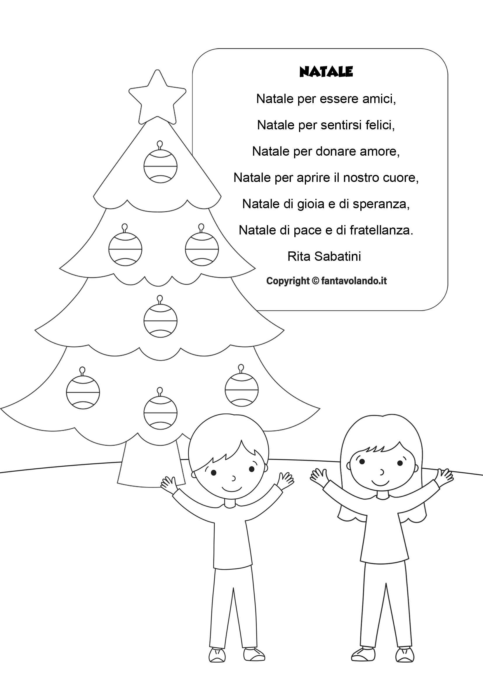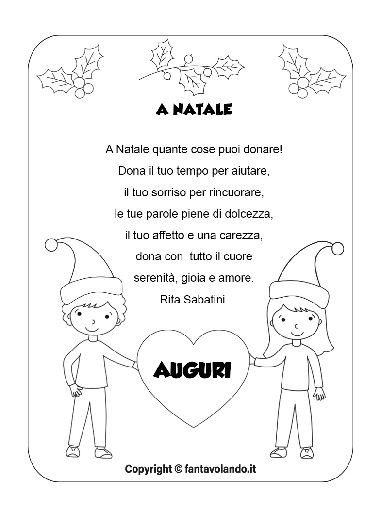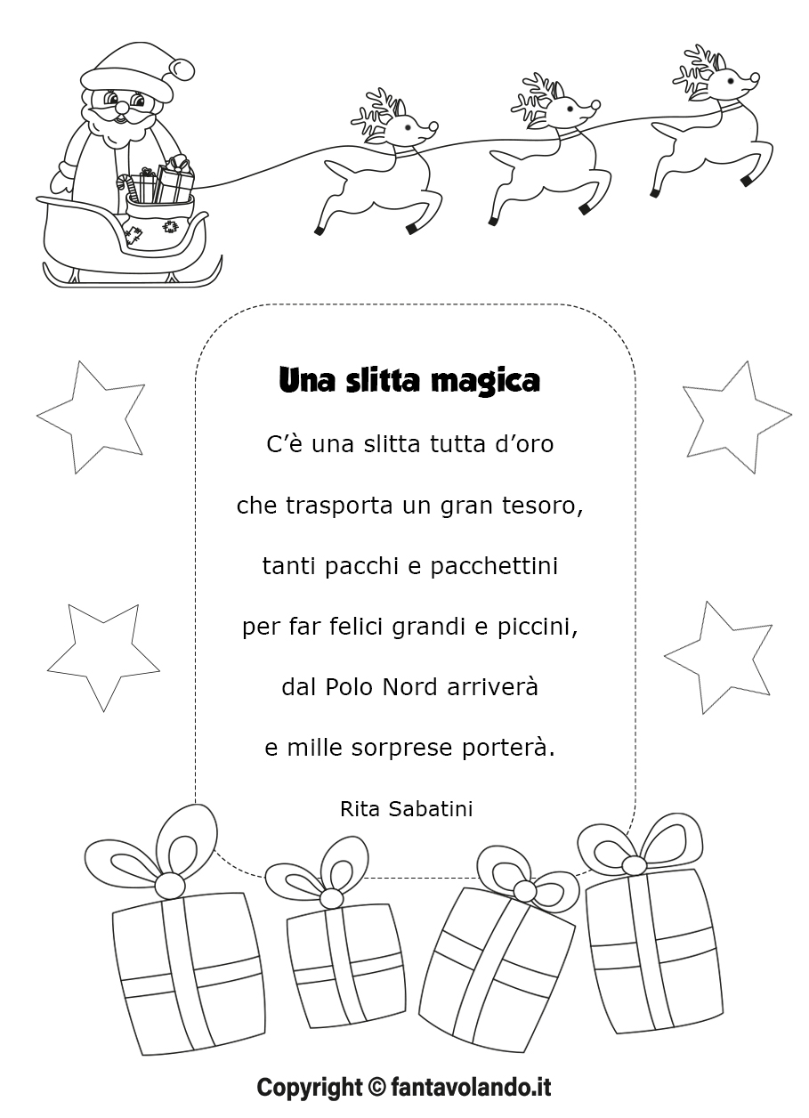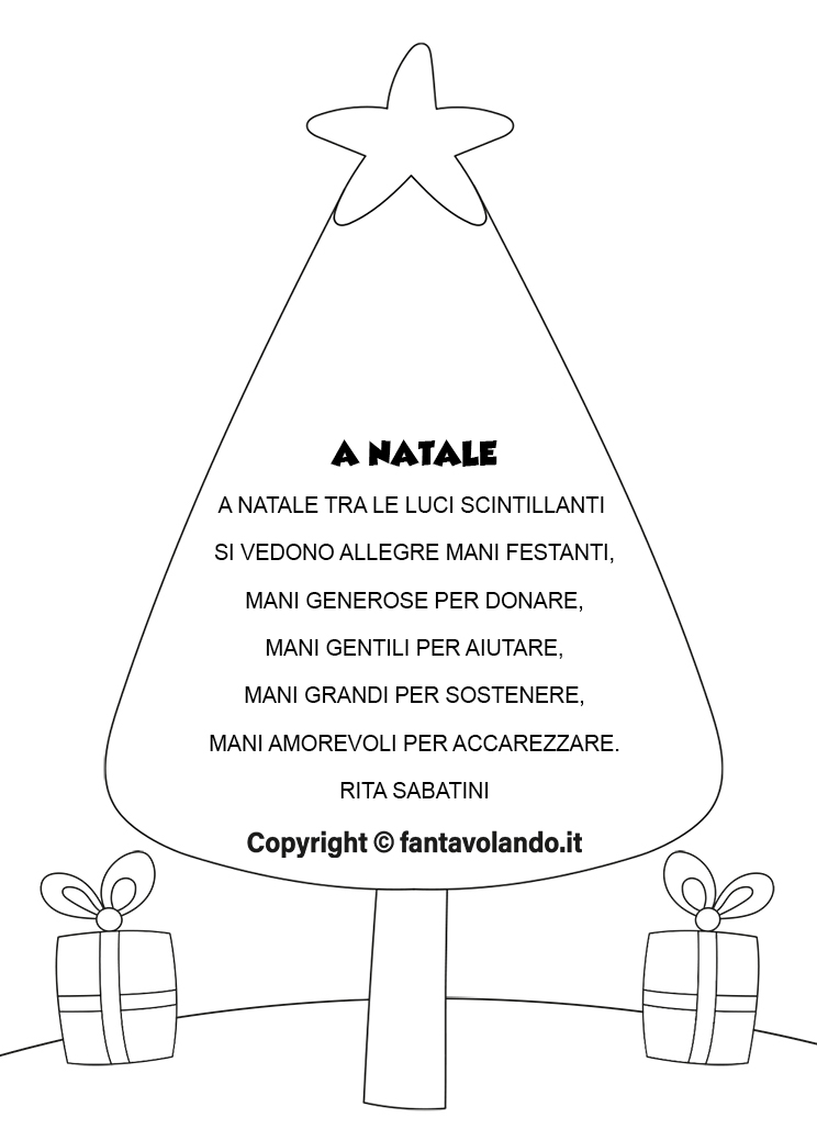 In questo post potete trovare le poesie di Rita Sabatini per Natale (tutti i diritti riservati). Proporre delle poesie è un’attività molto importante per arricchire il lessico e favorire la capacità di memorizzare. Le poesie di Fantavolando sono studiate in modo da facilitare la memorizzazione, per ogni poesia c’è anche un disegno da colorare.