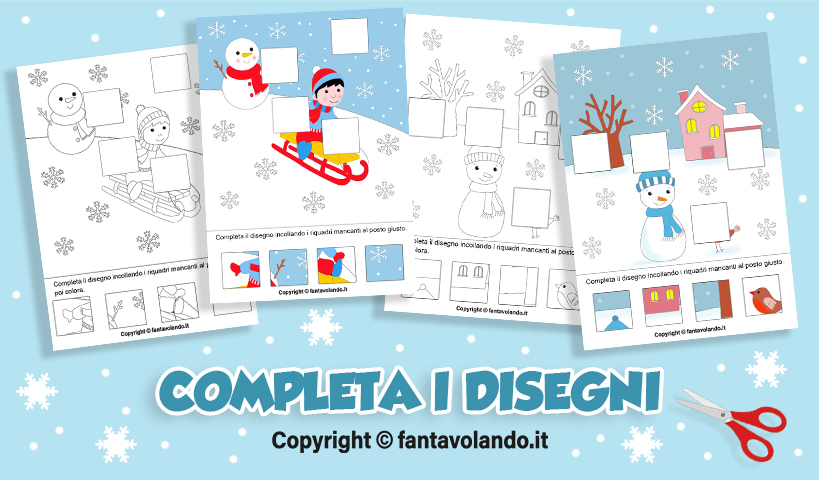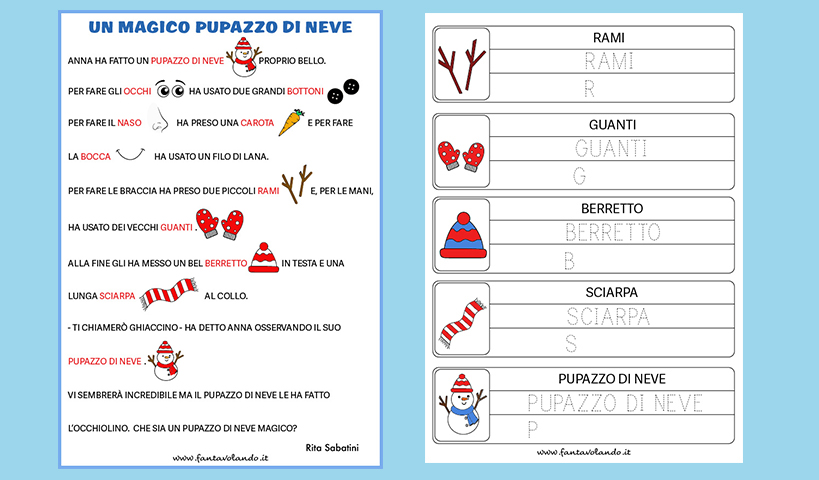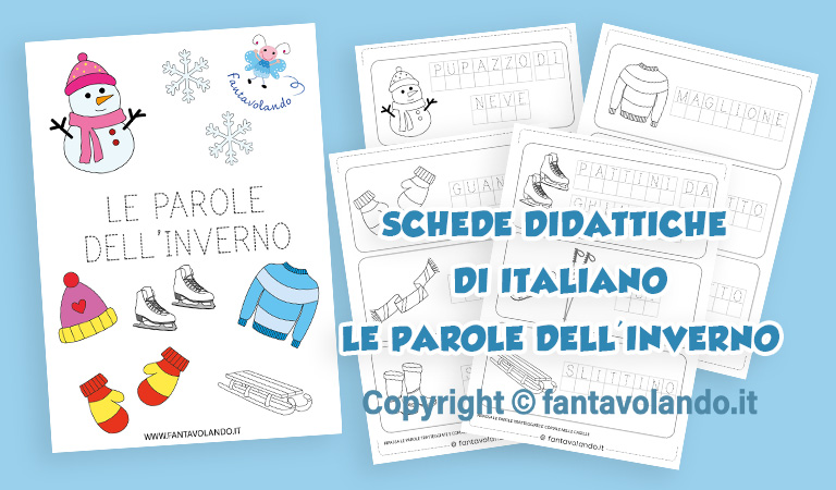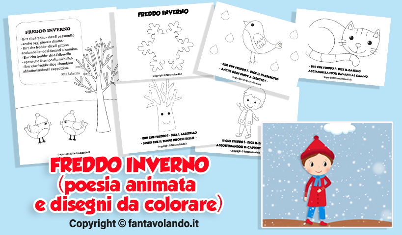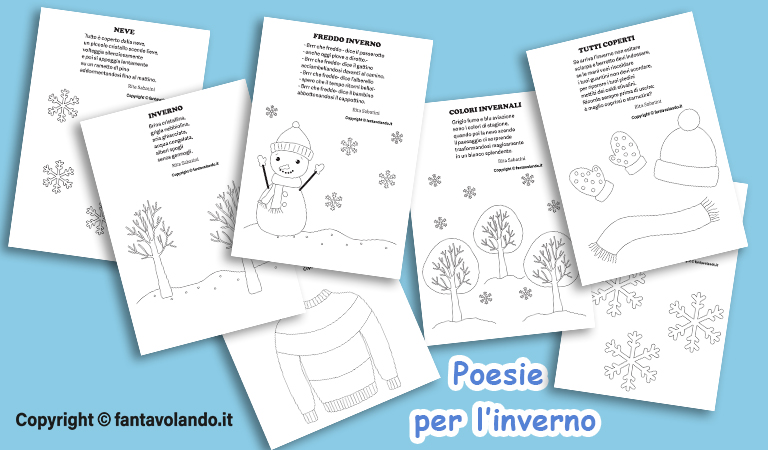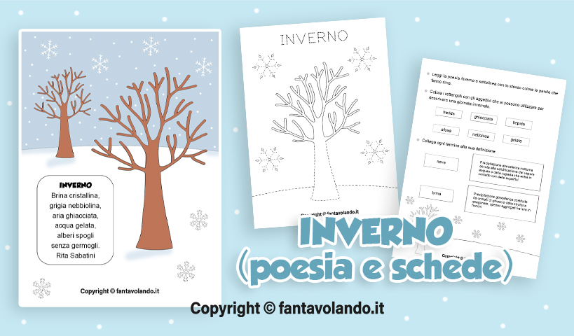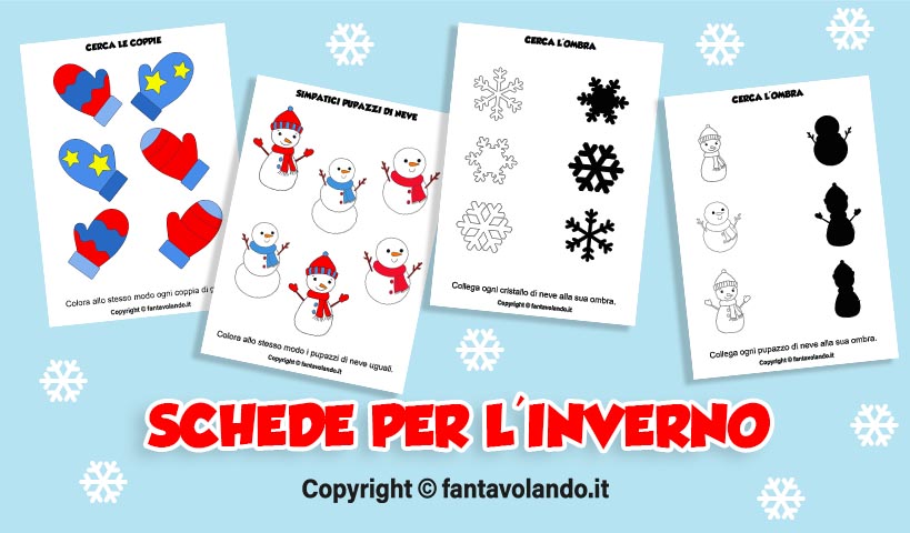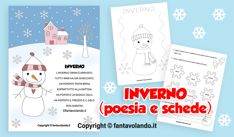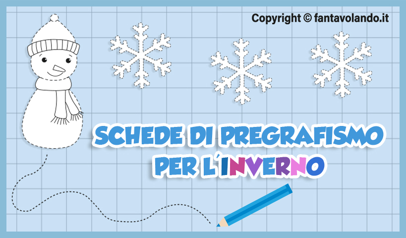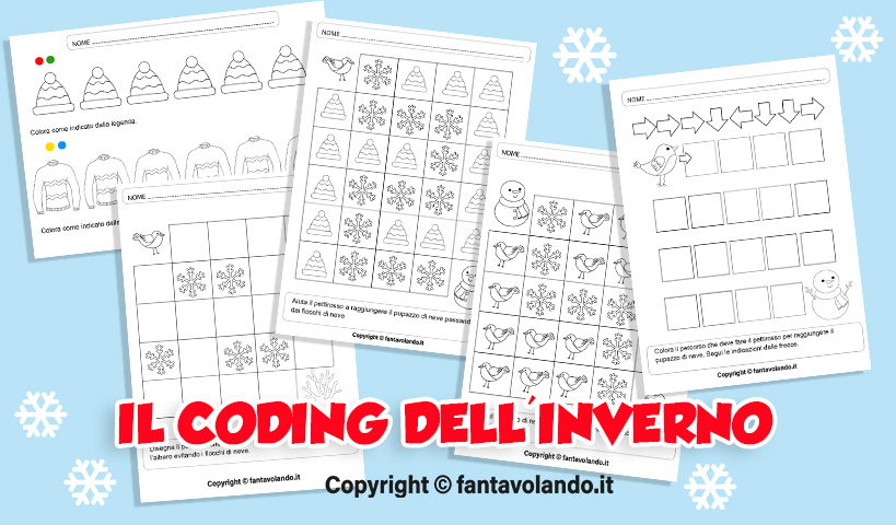 In questo post potete vedere l’indice di tutti i materiali disponibili nel sito relativi all’inverno suddivisi per tipologia. Nel sito di Fantavolando trovate tantissimi lavoretti, schede didattiche, attività per bambini, disegni da colorare, festoni, decorazioni, pregrafismo, storie, poesie, coding per l’inverno. Cliccando sulla scritta sotto ogni immagine si apre il link al relativo post, nei post indicati troverete le schede da stampare per realizzare le attività.