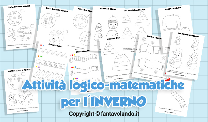 | Le schede di pregrafismo di Fantavolando per l’inverno | Le schede logico-matematiche di Fantavolando per l’inverno |