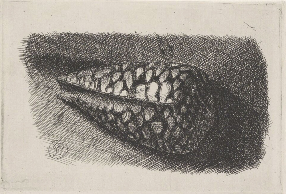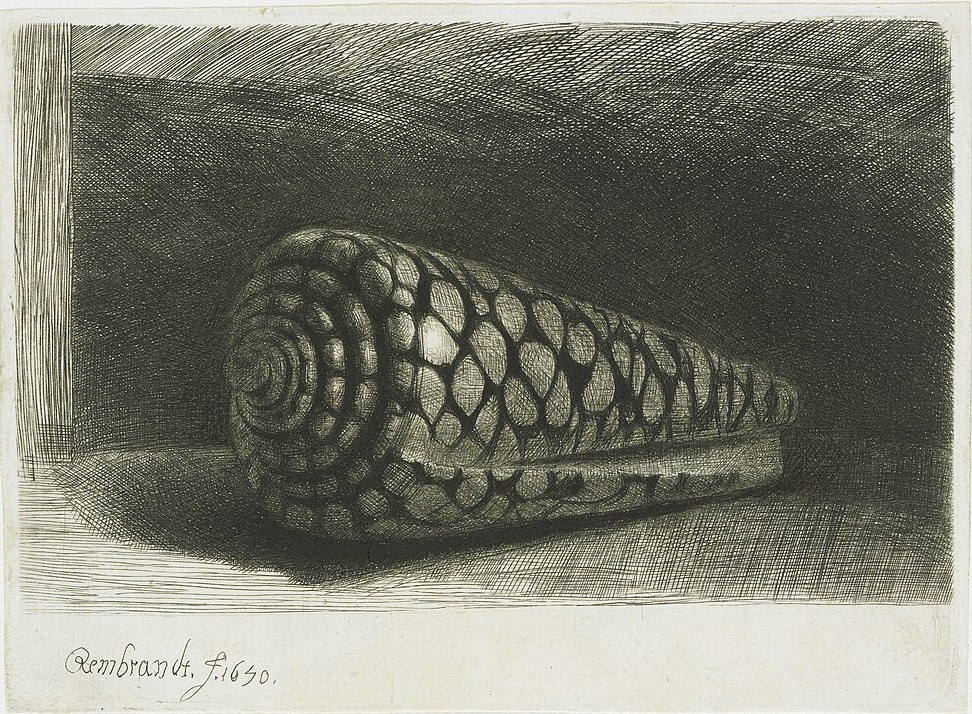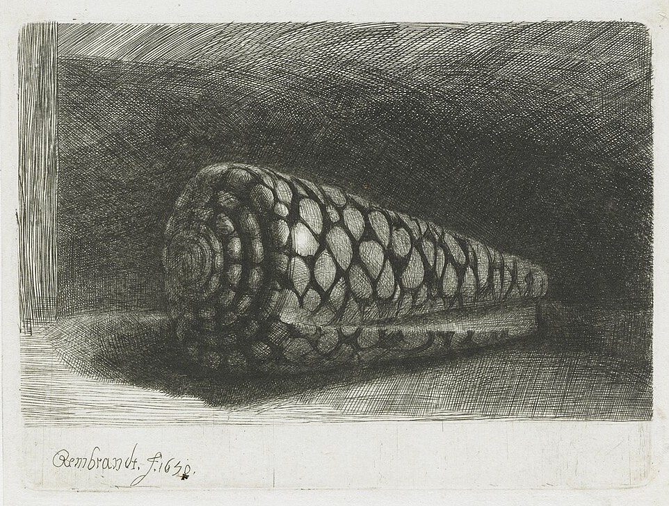 Si tratta di un’acquaforte che il pittore olandese ha realizzato nel 1650, la sua unica natura morta creata con l’incisione. Il soggetto è un Conus marmoreus, il guscio di un mollusco proveniente dai mari tropicali dell’estremo Oriente. Per vedere meglio i dettagli potete esplorare l’immagine del Rijksmuseum di Amsterdam.
