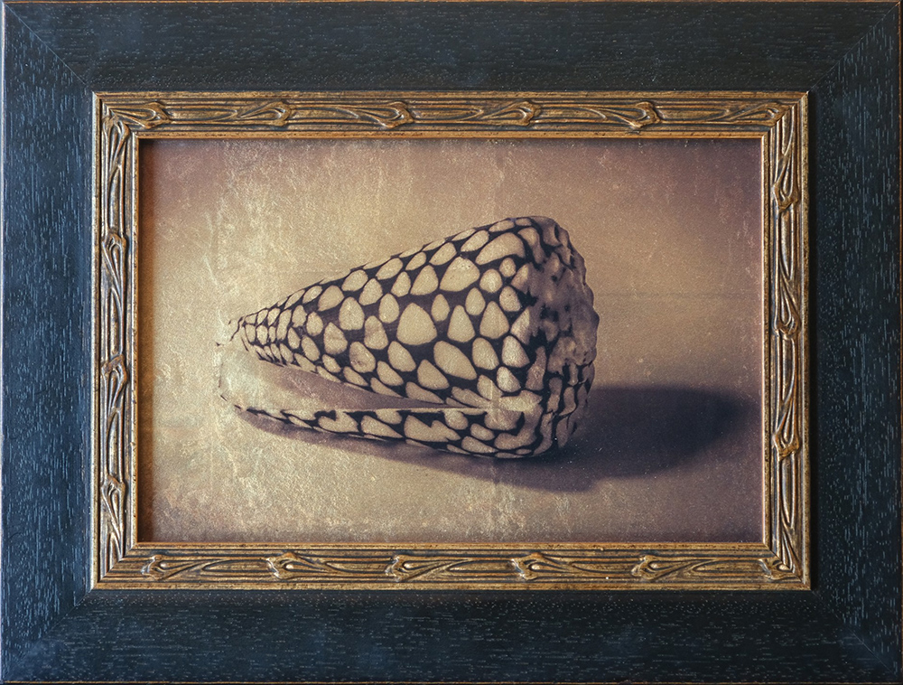 Kate Breakey, Conus da Rembrandt, 2015, foto stampata su vetro e coperto con foglia d’oro, cm 15×22