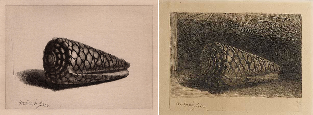 La spiegazione è semplice: Rembrandt ha creato l’incisione copiando la conchiglia sulla lastra di rame esattamente come la vedeva, a grandezza reale (è lunga circa 6,5 cm). Ma quando poi ha inchiostrato la lastra usandola come matrice di stampa, l’immagine si è ribaltata. Questo non è avvenuto per la sua firma perché l’autore l’ha incisa in forma riflessa in modo che venisse stampata correttamente. Dunque, se riflettiamo l’immagine, possiamo vedere come doveva essere il disegno originale inciso sulla matrice.
