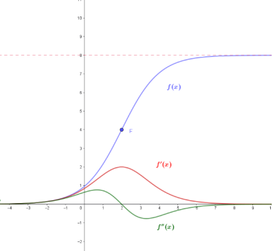 Il flesso (F(2,4)) è interpretato nel suo significato fisico. E’ il punto in cui la velocità di crescita raggiunge il massimo valore per poi diminuire e tendere asintoticamente a 0. La sua ordinata è (a/2 = 4), dove (a) è la massima densità di popolazione sostenibile, corrispondente al valore cui tende la variabile (y) al tendere di (x) a (+infty) .