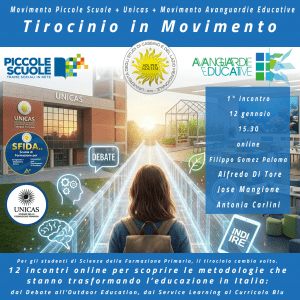 Tirocinio in Movimento è un ciclo di 12 incontri online promosso dall’Università di Cassino e del Lazio Meridionale, in collaborazione con il Movimento delle Avanguardie Educative e il Movimento delle Piccole Scuole INDIRE, pensato per offrire agli studenti uno sguardo vivo, critico e aggiornato sulle metodologie didattiche innovative e sui nuovi contesti educativi.