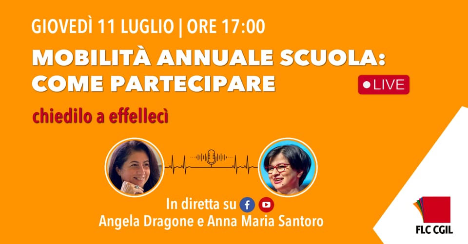 Giovedì 11 luglio alle ore 17.00 si terrà l’appuntamento con “chiedilo a effellecì” sulla mobilità annuale scuola. Sono, infatti, aperte le istanze per presentare domanda di…
