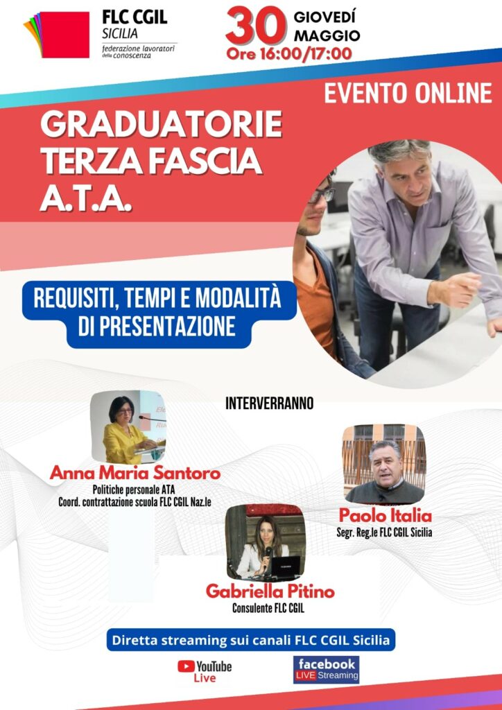 A cura della FLC CGIL Sicilia Aggiornamento graduatoria terza fascia personale Ata, requisiti e domanda. È questo il tema dell’incontro che si terrà giovedì 30…